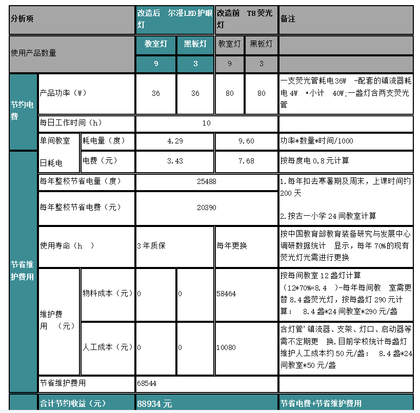 1、在项目初期,本公司多次落地考察,针对该校各个规格不同的共24个教室做出相对于的照明改造方案,结合当地的地理位置,利用自然光相结合模拟出最适合的效果以及安装方式。而灯具的可调背板也极大节省了安装时间。改造后,对学生视觉的舒适度证明,眩光,频闪,蓝光等均远超国家标准。2、照明灯具的使用寿命和维护成本,对国家层面来讲,关系到节能减排和建设节约型社会的大局,因为较短使用寿命意味着灯管生产过程能耗和污染增加。对使用学校来说,关系到使用维护的物力和人成本。以古一小学24间教室为例,计算改造后每年节约费用为88934元:为学校带来较大的经济效益。