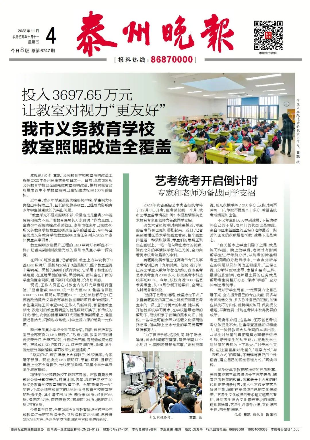 义务教育学校教室照明改造工程是2022年泰州民生实事项目之一。目前,全市306所义务教育学校已全部完成教室照明改造,提前实现省政府要求的中小学教室照明卫生标准达标率100%的目标。
