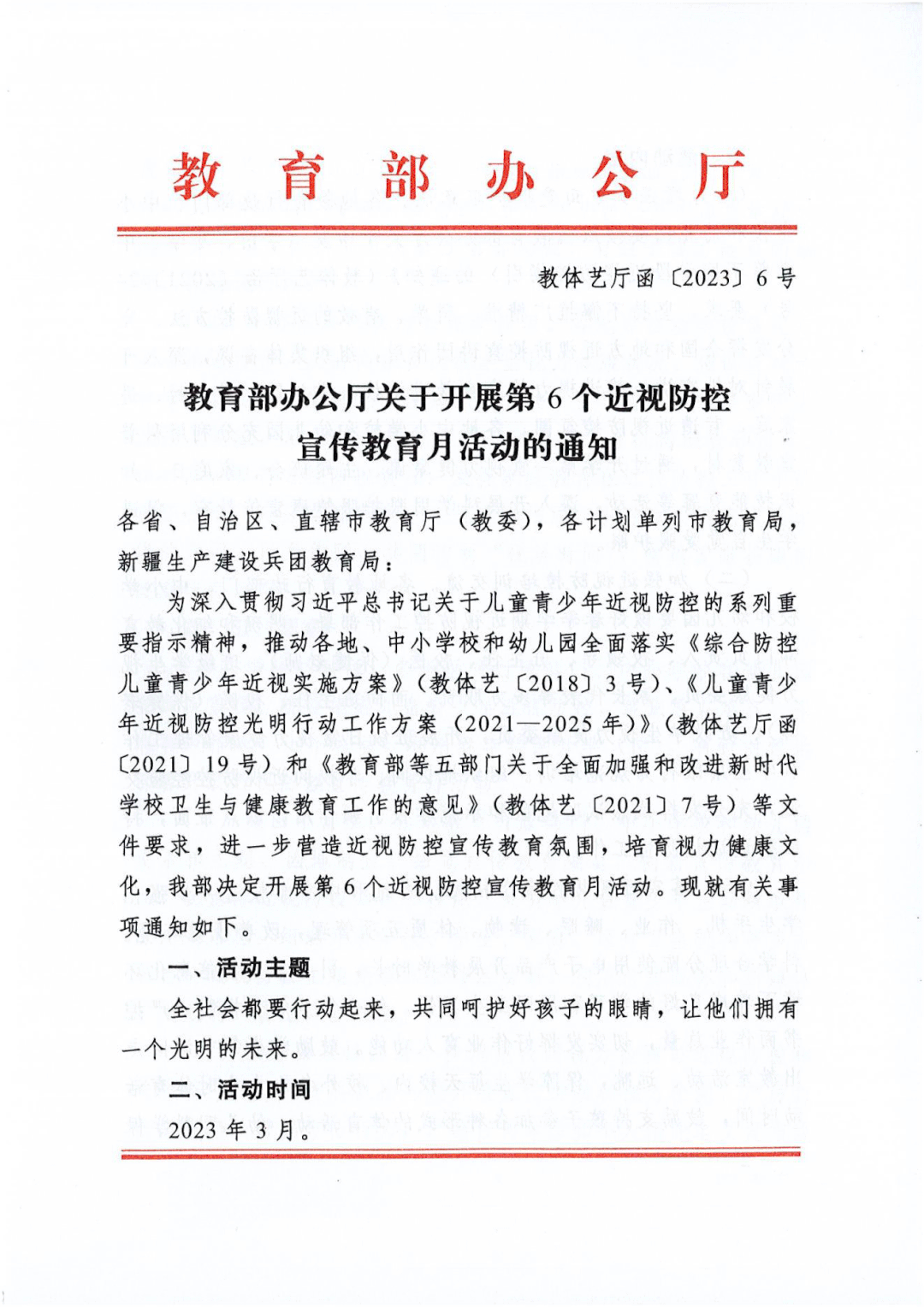 2月28日,教育部印发《关于开展第6个近视防控宣传教育月活动的通知》,部署各地教育行政部门、中小学校和幼儿园在2023年3月开展以“全社会都要行动起来,共同呵护好孩子的眼睛,让他们拥有一个光明的未来”为主题的近视防控宣传教育月活动。